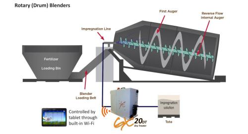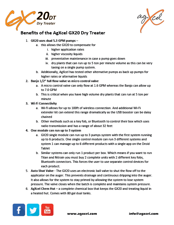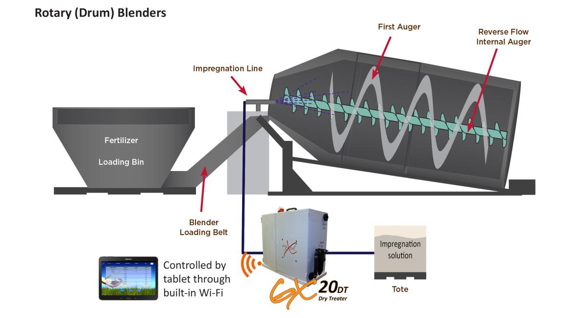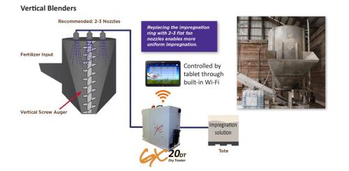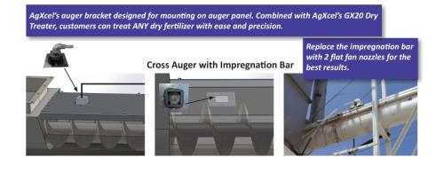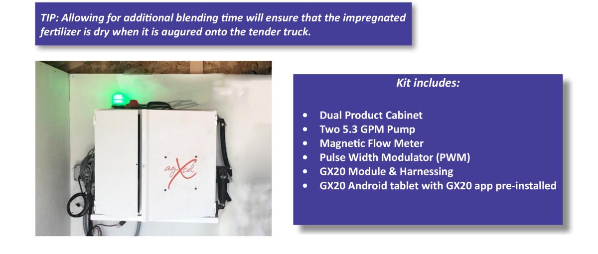 The AgXcel Dry Treating solution allows for the precise application of chemicals for treating dry fertilizer. The GX20 Dry Treater solution allows for a multitude of application environments and the GX20 Software App allows for various configuration to allow for multiple treatment methods. Allows the user to setup treatment styles such as