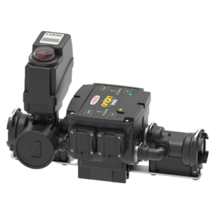 The system consists of a diverter valve and two electromagnetic flowmeters with contiguous measuring ranges (e.g. 0.5-10 l/min / 0.13-2.6 GPM and 10-200 l/min / 2.6-53 GPM).