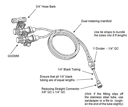 The GX6 incorporates a dual manifold dispensing solution for dual flow and for pressure regulation. The dual manifold incorporates 2 valve bodies with an embedded 4lb check valve that allows for the regulating of flow into 1 metering tubing or dual depending on the pressure of the system and viscosity of the solution. When managing any system that utilizes high viscosity solutions, the management of proper system pressure is critical to precision application achievement. If too much pressure is achieved, then flow restriction occurs which reduces product flow and enables inaccurate product measurement. The GX6 dual metering manifold system addresses this issue with the ability to manage and control dual metering flow to allow the liquid to stream stress-free through dual tubes.