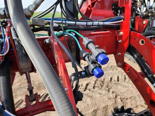 A GX5 is in use with the GX7 ISO row monitor system to apply an NH3 stabilizer. While also using the GX6 dual check valve and dual microtubes to quickly change orifice sizes and greatly reduce rows from plugging.